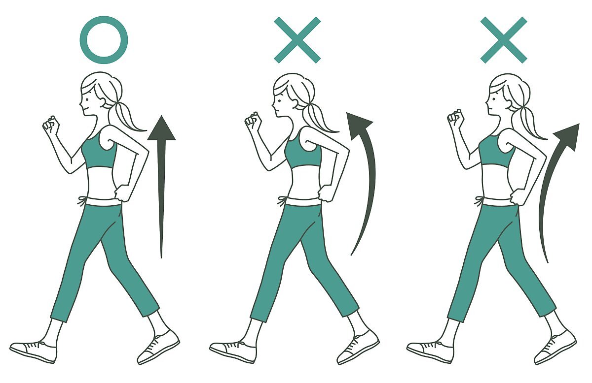 팔은 자연스럽게 흔들리도록 편안하게 흔들어야 합니다. 그리고 팔꿈치를 90도로 유지하고 전후로 흔들리도록 합니다.