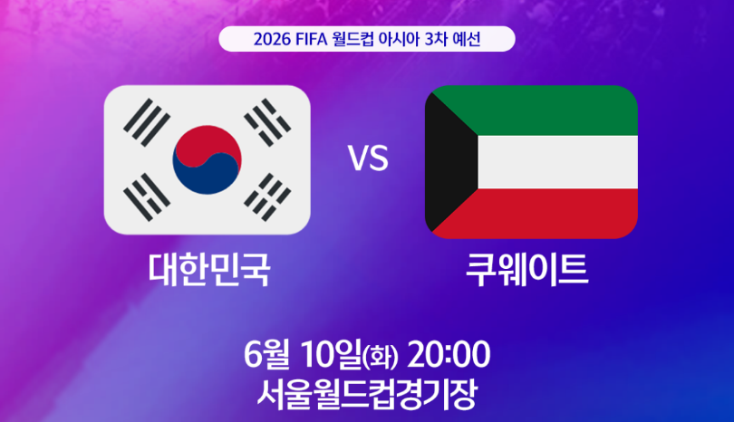2026 FIFA 북중미 월드컵 아시아 3차 예선의 마지막 경기인 대한민국과 쿠웨이트의 맞대결이 오는 2025년 6월 10일(화) 오후 8시, 서울월드컵경기장에서 펼쳐집니다. 대한민국은 6월 6일 이라크전에서 2대 0으로 승리를 하여 월드컵 본선 진출은 확정된 상태입니다. 3차 예선 최종 쿠웨이트전 축구 경기 일정 및 장소, 중계방송에 대하여 알아보겠습니다.