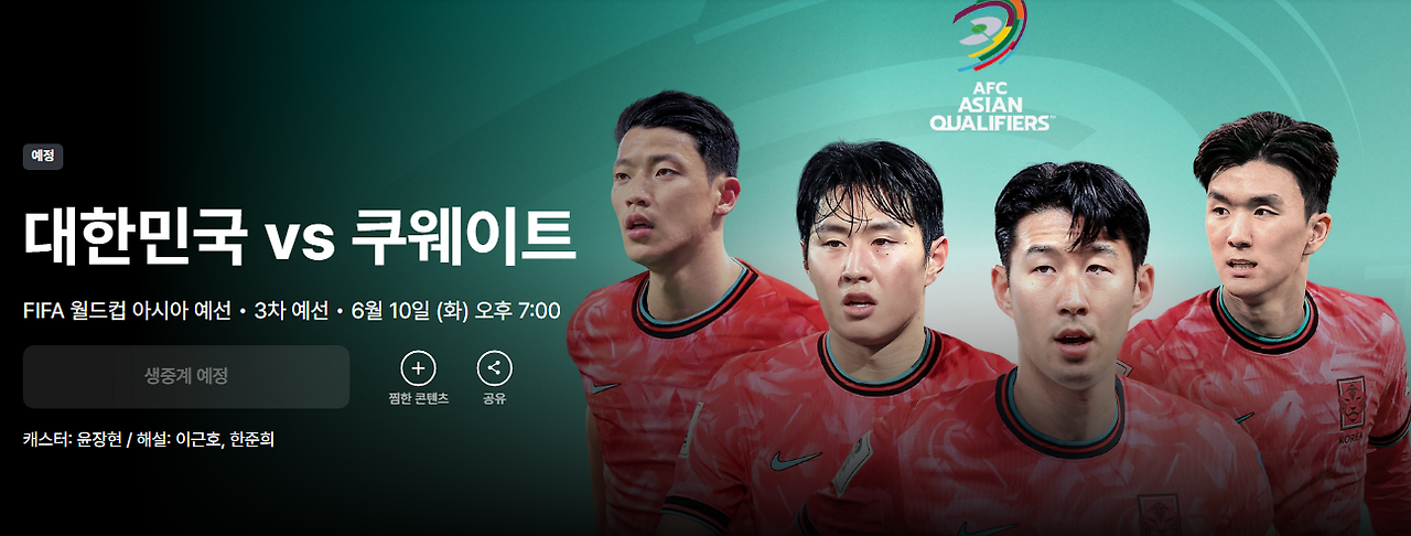 대한민국은 승패에 부담이 덜한 쿠웨이트전에서 젊은 선수들을 적극 기용할 예정이며, 유럽파와 국내파 선수들의 활약과 함께, 축구 팬들의 뜨거운 응원이 필요합니다. 지상파 MBC와 쿠팡플레이를 통해 실시간으로 경기를 시청하시고, 서울월드컵경기장에서 직접 응원의 함성을 대한민국 축구대표팀에게 보내주시기 바랍니다. 대한민국 축구대표팀 파이팅입니다!
