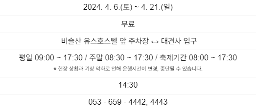 | == 목 차 == ㅇ 비슬산 참꽃축제 기간 및 개화상황 ㅇ 행사내용(프로그램) ㅇ 주차장 및 교통정보 안내 ㅇ 비슬산 투어버스 안내 |