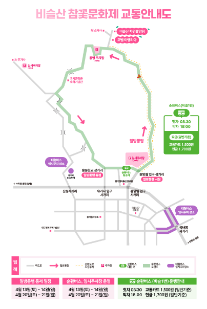 비슬산 참꽃축제에 편리하게 방문하실 수 있도록 주차장 및 교통정보를 아래와 같이 안내해 드립니다.