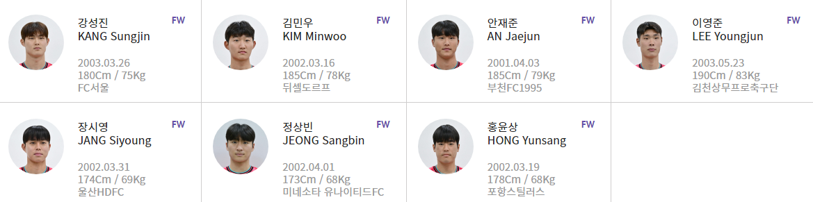 ▶ FW(공격수) : 강성진(서울) 김민우(뒤셀도르프)  장시영(울산현대) 정상빈(미네소타 유나이티드 FC)