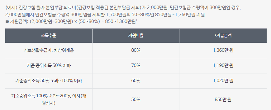 – 국가·지방자치단체 지원금, 민간실손보험 수령금 등) X 지원비율(50~80%)