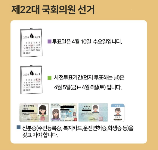 사전투표를 해야 하는데 망설이고 계신가요. 다가오는 제22대 국회의원 선거일(4월 10일)에 투표가 어려우신 분은 사전투표를 실시하여 주어진 국민의 권리를 행사하시면 되겠습니다. 신분증을 가지고 사전투표소로 가시면 투표할 수 있습니다.