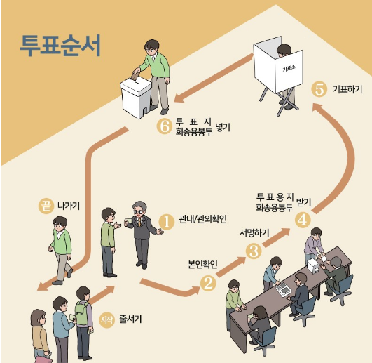 ▶ 관내 선거인 절차는 아래와 같은 절차로 진행되며, 마지막으로 투표함에 투표용지를 넣고 퇴장하면 됩니다.