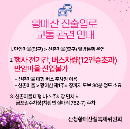 일반통행 운영으로 입구는 만암마을에서 출구는 신촌마을이 되겠습니다. 행사 전 기간 버스차량(12인승 초과)은 만암마을로 진입이 불가함으로 신촌마을 입구 임시 버스주차장을 이용하시고, 신촌마을 대형버스 만차시는 금포리 주차장을 이용하시면 됩니다.
