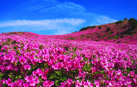 특히, 황매산은 해발 800~900m 지점에 광활한 구릉지로 형성되어 대규모 철쭉군락을 형성하고 있습니다. 황매산 철쭉이 만개되면 산허리를 붉게 물들여 정말 장관을 이루고 있어 관광객이 몰려드는 명소입니다.