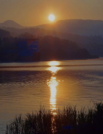 잔잔한 호수 위로 비치는 해의 반영이 매우 인상적이에요.